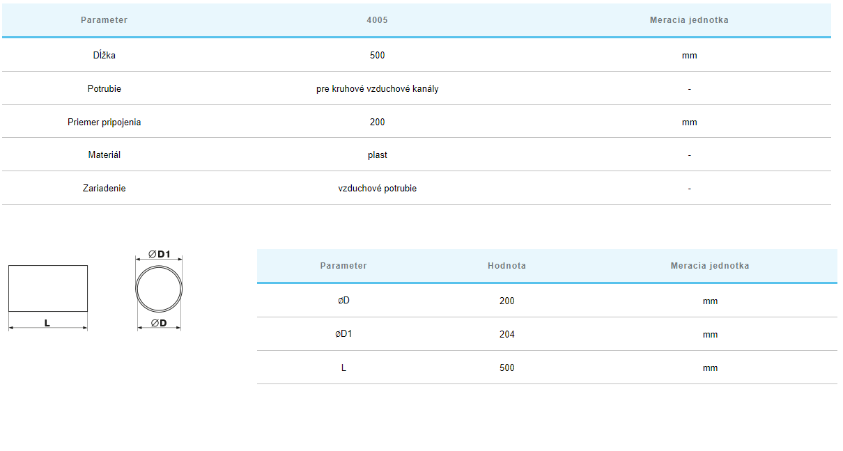 | Okrúhle potrubia PLASTOVÉ-vnútorný ⌀ | ⌀200mm |