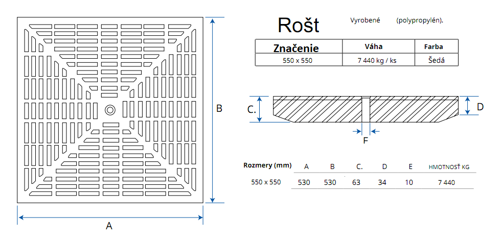 Plastový rošt 550×550 mm pre revíznu šachtu, rám sa používa ten istý ako k poklopu. Nosnosť: 1,5 tony.