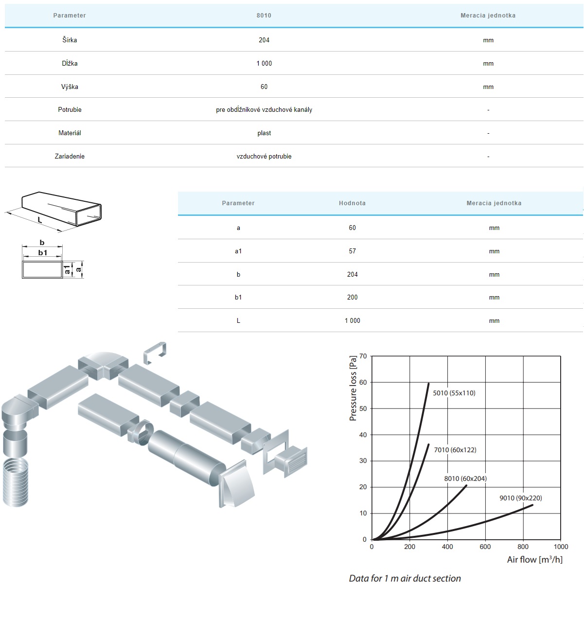 Plastové potrubie hranaté 60x204mm z PVC, dĺžka 1m, vhodné pre vetracie systémy. Teplotný rozsah: -30°C až +70°C.