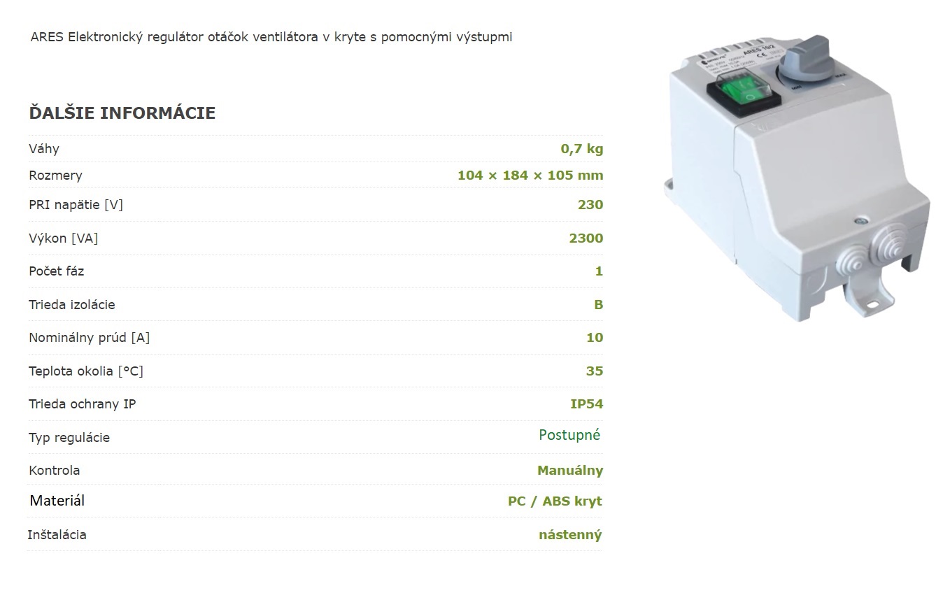 Regulátor otáčok ARES 10A pre ventilátory, s KickStart a IP54 pre vetracie systémy.