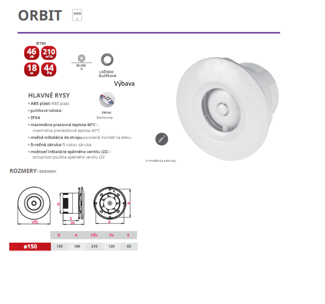 Kód: 8343 VENTS- Vlastnosti-výbava ventilátora : Časový dobeh, Gulôčkové ložisko-vhodná do stropu aj na stenu, Turbo-zvýšený výkon