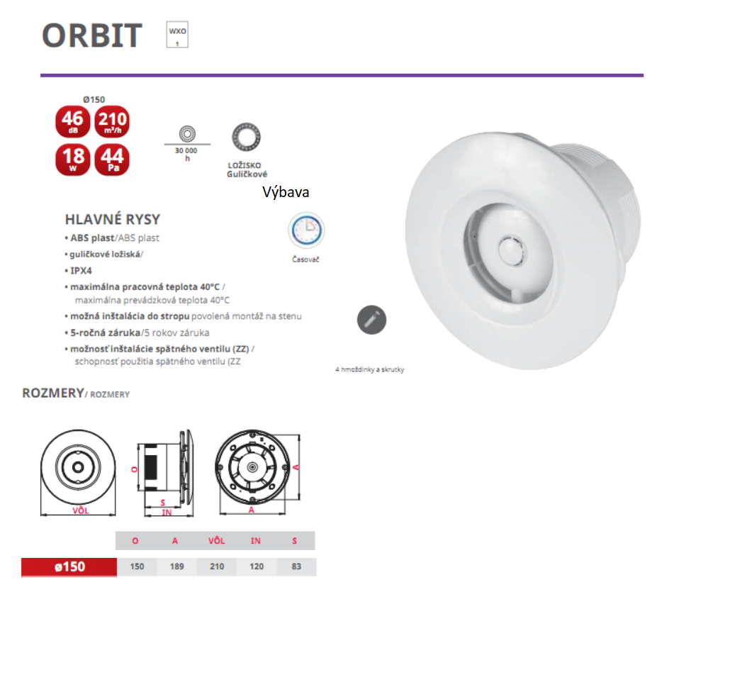 Kód: 24 VENTS- Vlastnosti-výbava ventilátora : Parový /vlhkostný/senzor má automaticky časový dobeh