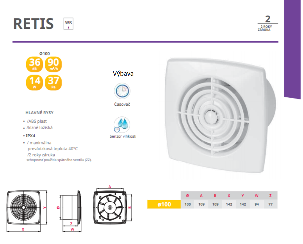 Kód: 2281 VENTS- Vlastnosti-výbava ventilátora : Gulôčkové ložisko-vhodná do stropu aj na stenu, Parový /vlhkostný/senzor má automaticky časový dobeh
