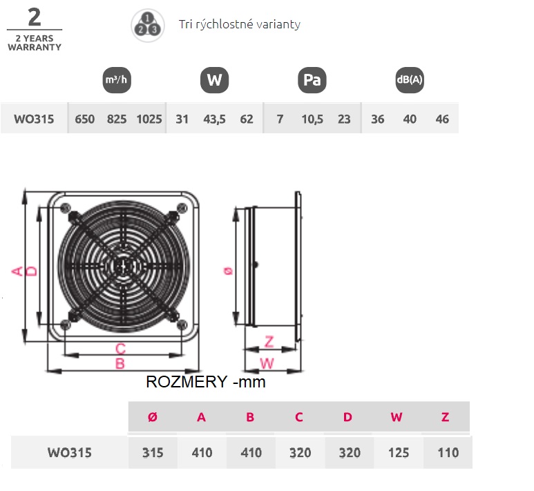Axiálny ventilátor AWENTA WO 315 s 3-rýchlostným výkonom 650/825/1025 m³/h a priemerom Ø 315 mm je určený na vetranie veľkých úžitkových miestností, komerčných priestorov, garáží a malých gastronomických priestorov, kde je potrebná vyššia výmena vzduchu. Ventilátor môže byť inštalovaný vo ventilačných kanáloch alebo priamo do stien ako odsávací ventilátor. Vďaka 3-stupňovým motorom je možné prispôsobiť parametre ventilátora potrebám užívateľa, v závislosti od spôsobu pripojenia. Hlavné rysy: Materiál puzdra je ABS plast. Motory sú vybavené klznými ložiskami, ochrana IP44, maximálna prevádzková teplota 40 °C. 2 roky záruka.