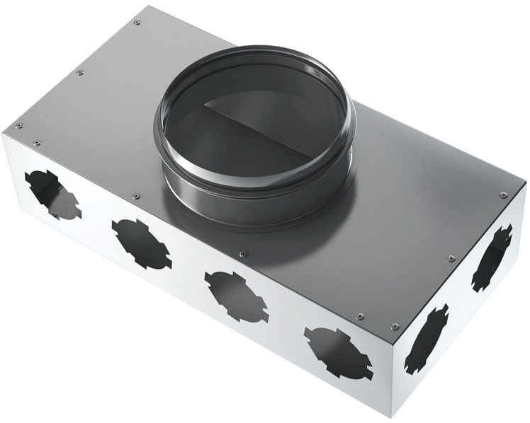Kovová rozdelovacia krabica Blauberg na rozvody rekuperácie. Vyrobená z ocele potiahnutej aluzinkom, s gumovým tesnením.