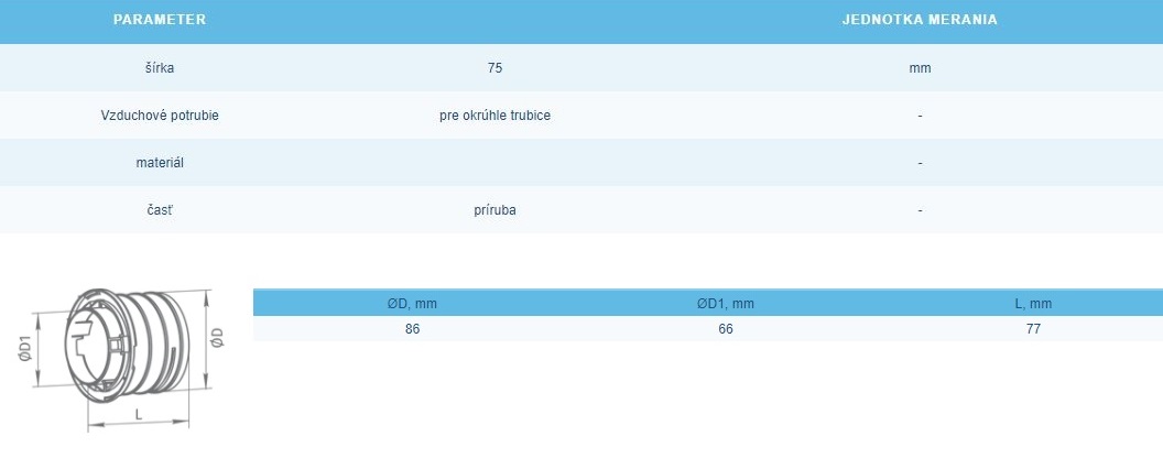 Blauberg RKF 75mm DN75 – Spojka k potrubiu. Upevnenie ventilačného potrubia pomocou zaisťovacieho krúžku. Tesniaci krúžok (špeciálne príslušenstvo) na tesnosť triedy C. Vyrobené z polypropylénu (PP) a elastoméru (SEBS). Prevádzková teplota -20 až +60.