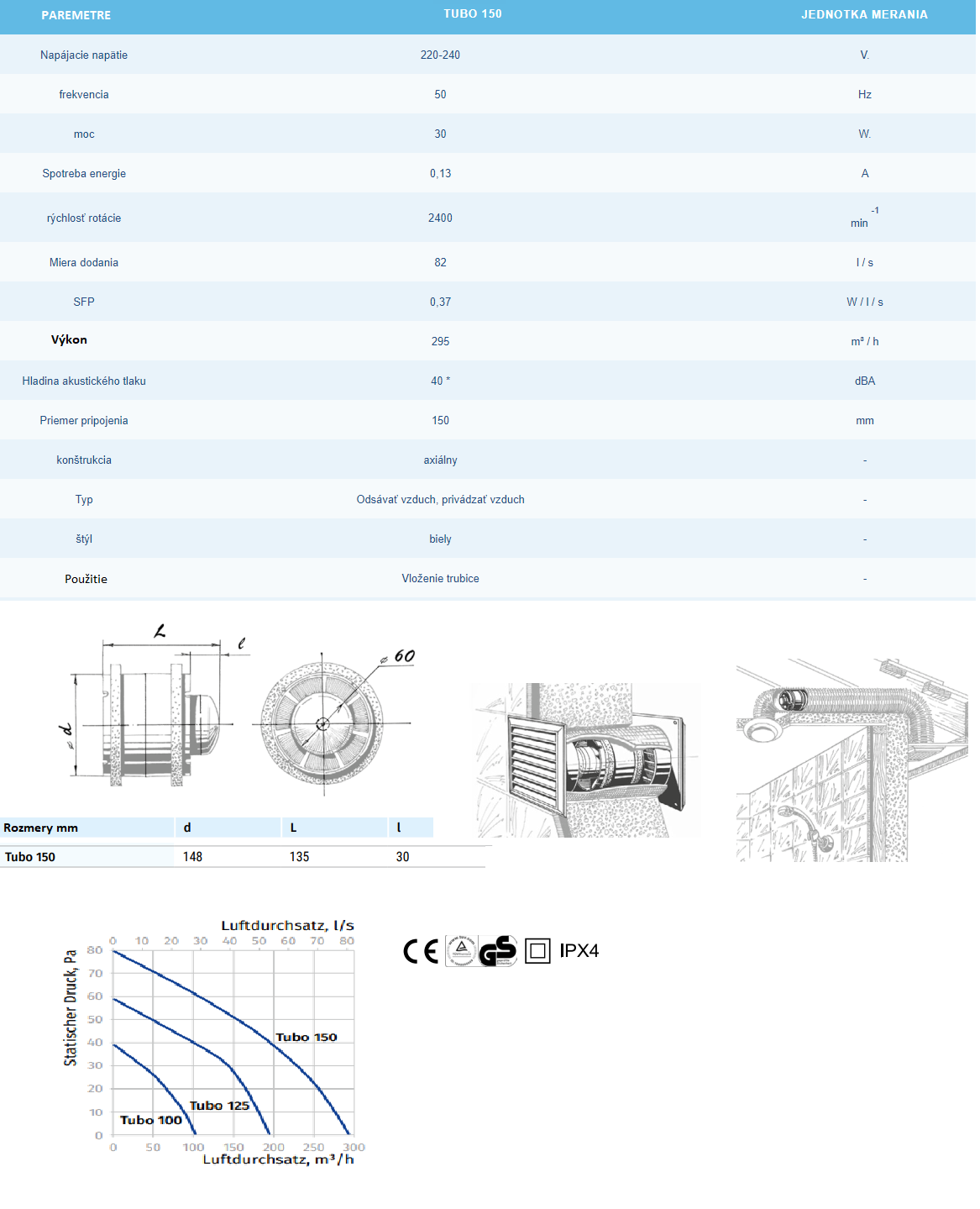 - Ventilátory do kúpeľne pre ⌀ potrubia : ⌀150mm-Filter zaradenia medzi výkon od 180-do 335m3/h