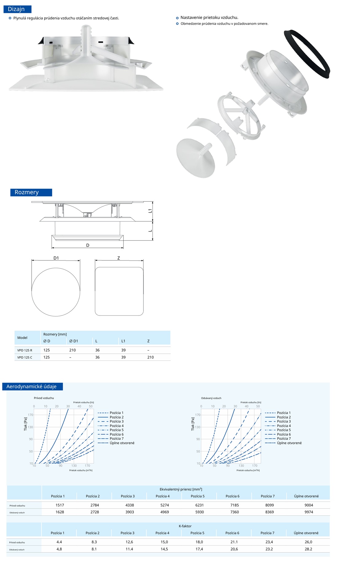 Blauberg VPD 125 C je tanierový ventil s ozdobným panelom, určený na reguláciu prietoku vzduchu v prívodných a odvodných vetracích systémoch.