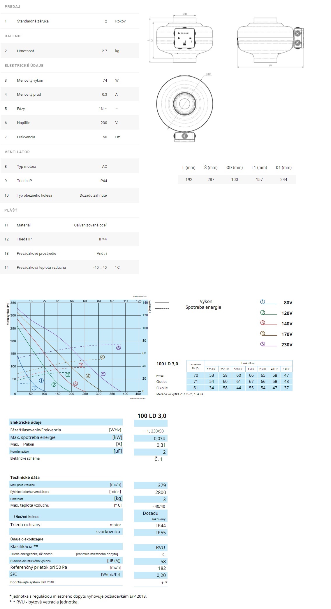 Kód: 326 VENTS- Priemyselné ventilátory pre potrubie ⌀ : ⌀100mm-Filter zaradenia medzi výkon od 114-do 425m3/h