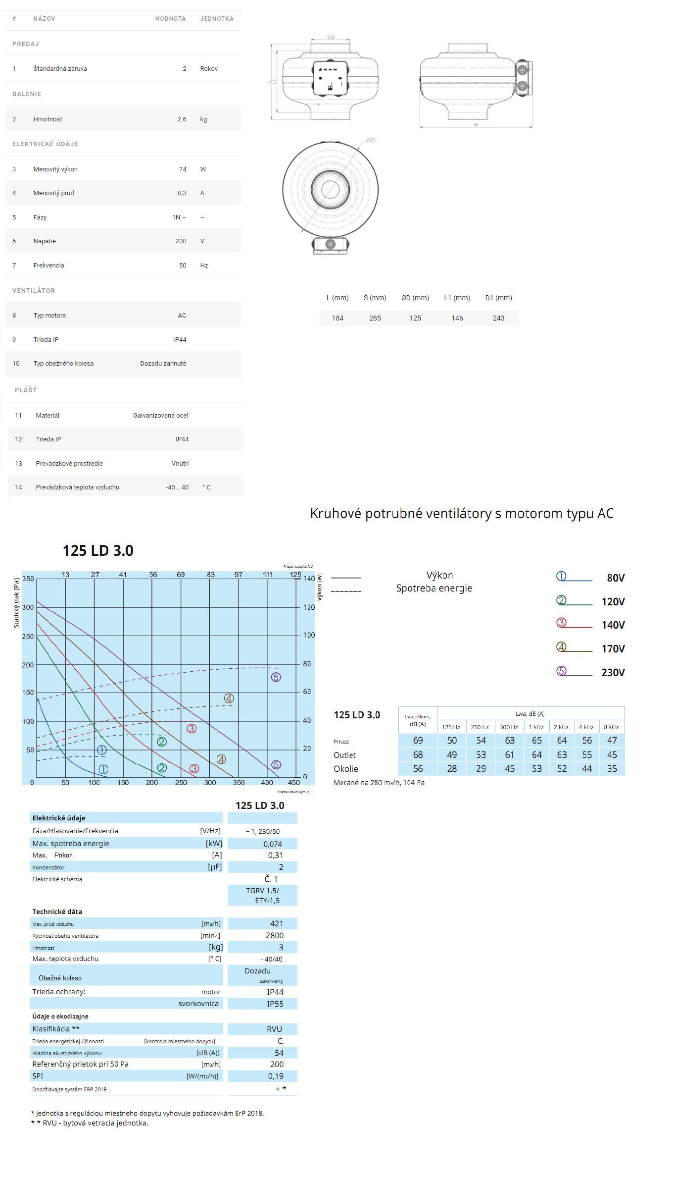 Kód: 328 VENTS- Priemyselné ventilátory pre potrubie ⌀ : ⌀125mm-Filter zaradenia medzi výkon od 114-do 505m3/h