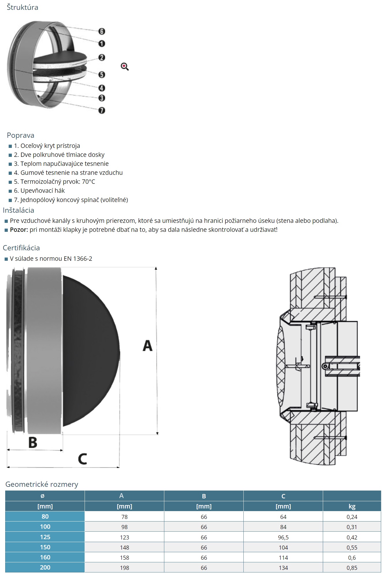 Protipožiarna spätná klapka CTCF90-160mm s 90 min. odolnosťou a 70°C tavnou poistkou.