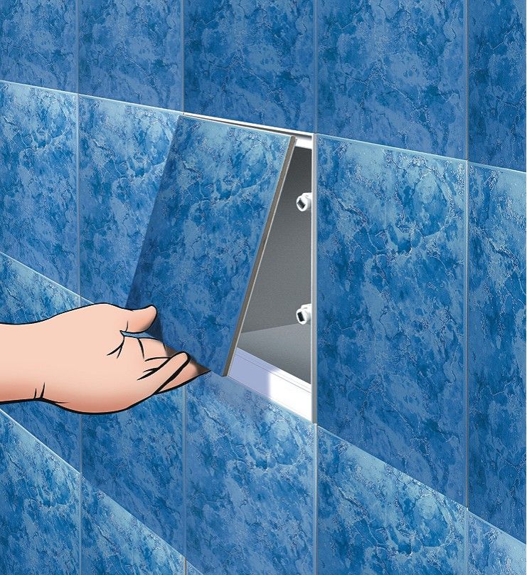 Design revíznych dvierok pod obklady: Profil revíznych dvierok je z PVC. Rámček obsahuje magnetky. Výškovo nastaviteľné magnety umožňujú dokonalé vyrovnanie dlaždíc. Keramická dlaždica sa ľahko nalepí na plechovú dosku. Revízne dvierka pod obklady majú jednoduchú údržbu a široký rozsah veľkostí. Otváranie revíznych dvierok pod obklady sa realizuje prísavkou.