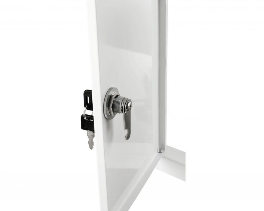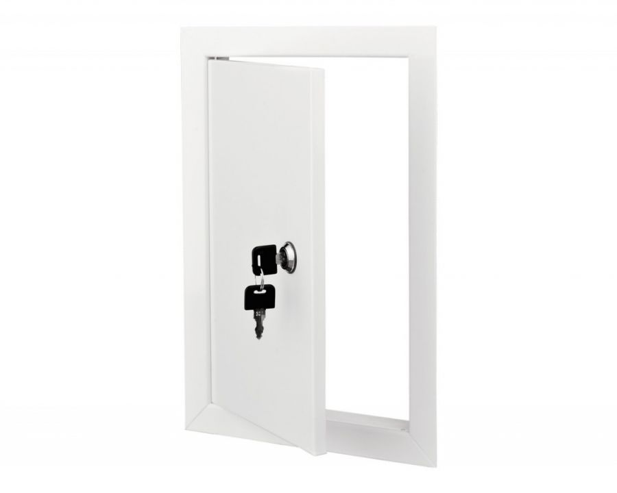 Kovové revízne dvierka so zámkom na kľúč sú vyrobené z oceľového plechu. Dvierka majú vonkajší rám, ktorý zakrýva nerovnosti montážneho otvoru. Povrch je chránený bielym komaxitovým lakom, ktorý zabezpečuje antikoróznu ochranu. Hlavné výhody: Univerzálna montáž do sadrokartónu a muriva.