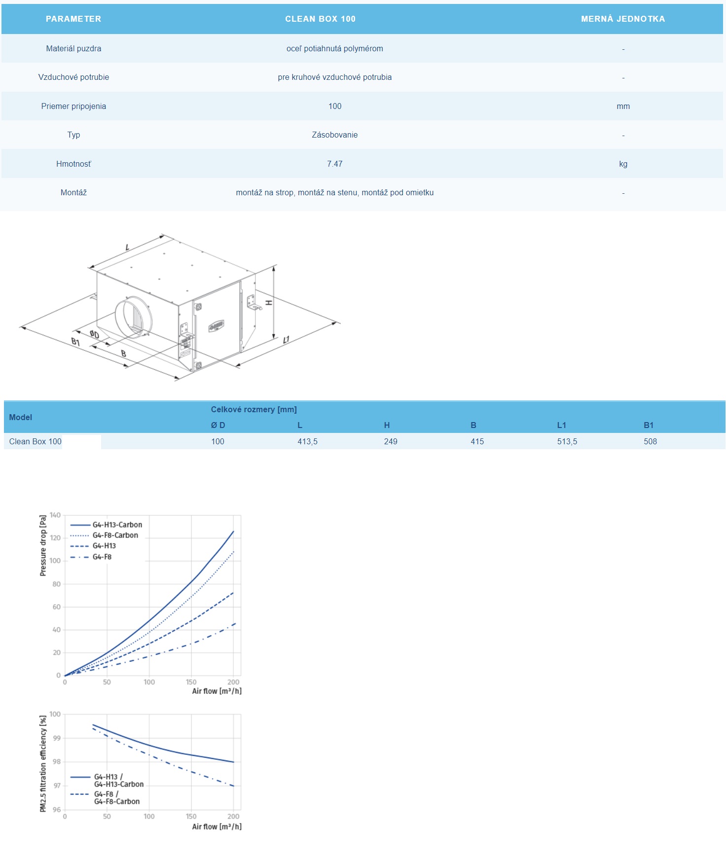 Filtre BLAUBERG CLEANBOX 100 G4+H13/HEPA/uhlíkový pre priemer 100 mm. Obsahuje Filter G4, HEPA filter H13 a uhlíkový filter. Vhodné do obmedzených priestorov.