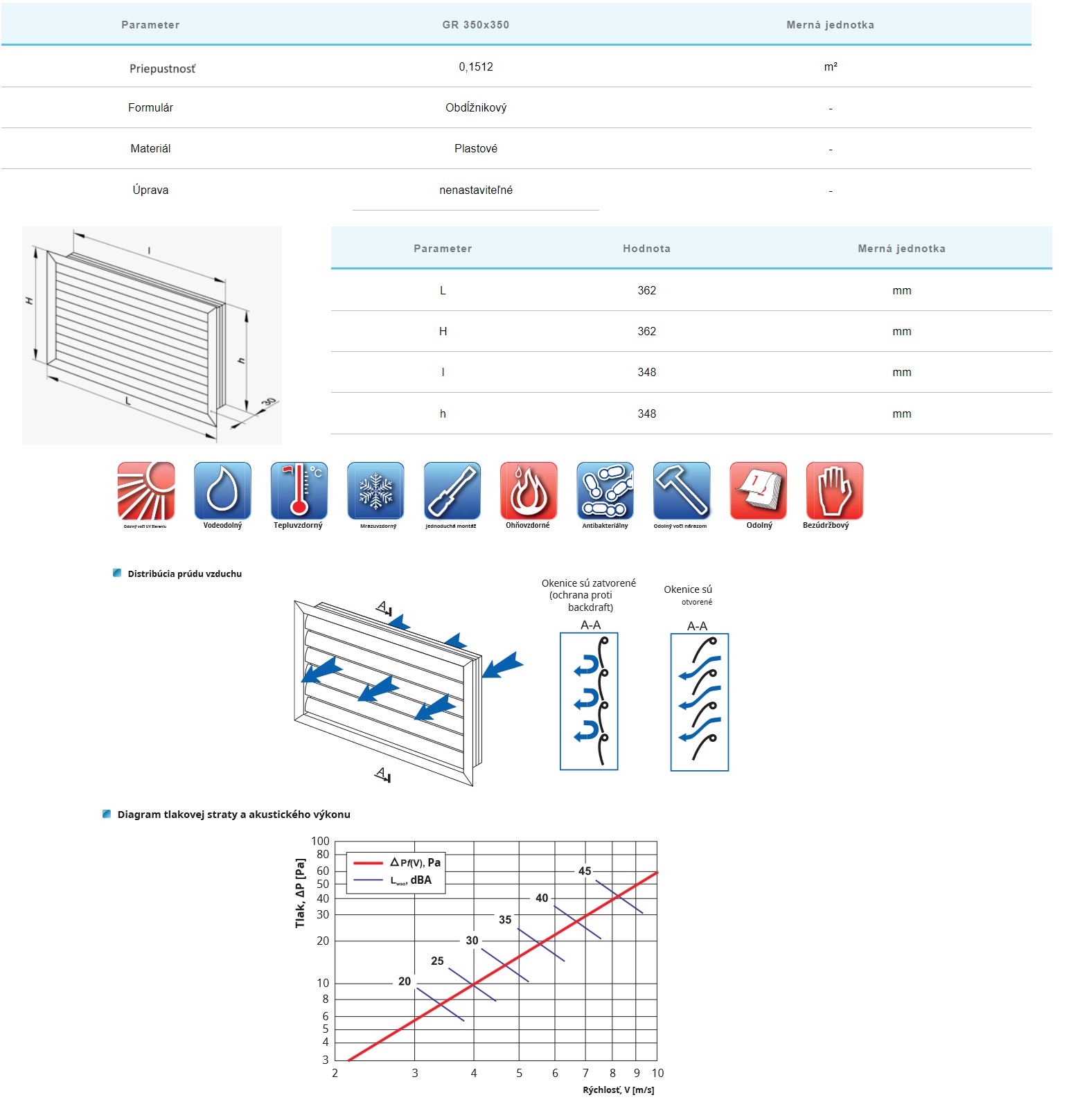 Plastová gravitačná mriežka GR 350×350 je vyrobená z vysoko kvalitného plastu, ktorý je odolný voči poveternostným vplyvom a teplotám. Je vybavená odnímateľnými pružinovými lopatkami, čo zabezpečuje jednoduchú údržbu. Montáž je rýchla a jednoduchá.