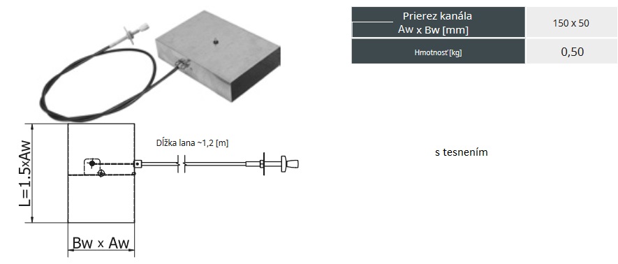 Klapka 150x50mm pre riadenie vzduchu s bovdenom a tesnením.