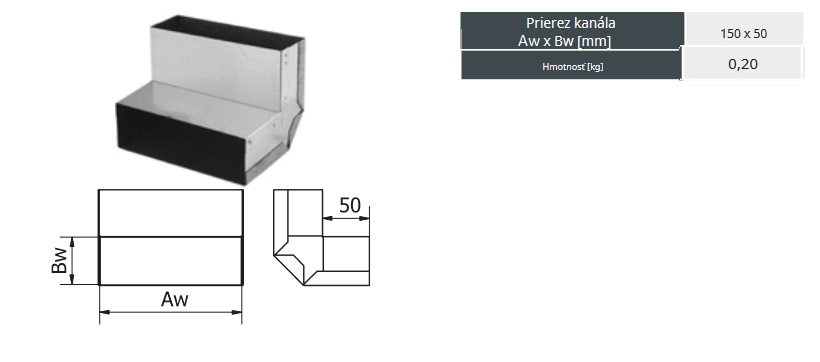 Hranaté potrubie 150x50mm je vyrobené z pozinkovaného plechu s hrúbkou 0,5mm. Je určené na prívod vzduchu ku krbu z exteriéru a rozvody teplého vzduchu od krbu v podlahe. Na každé spojenie prvkov sústavy je potrebná spojka 15×5 cm, bodovo zvárané. Prierez: 150x50mm.