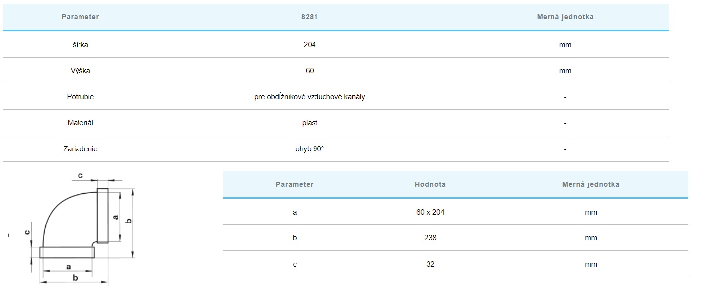 | Hranaté potrubia PLASTOVÉ- □ Výška × Šírka | □ V × Š-60x204mm |