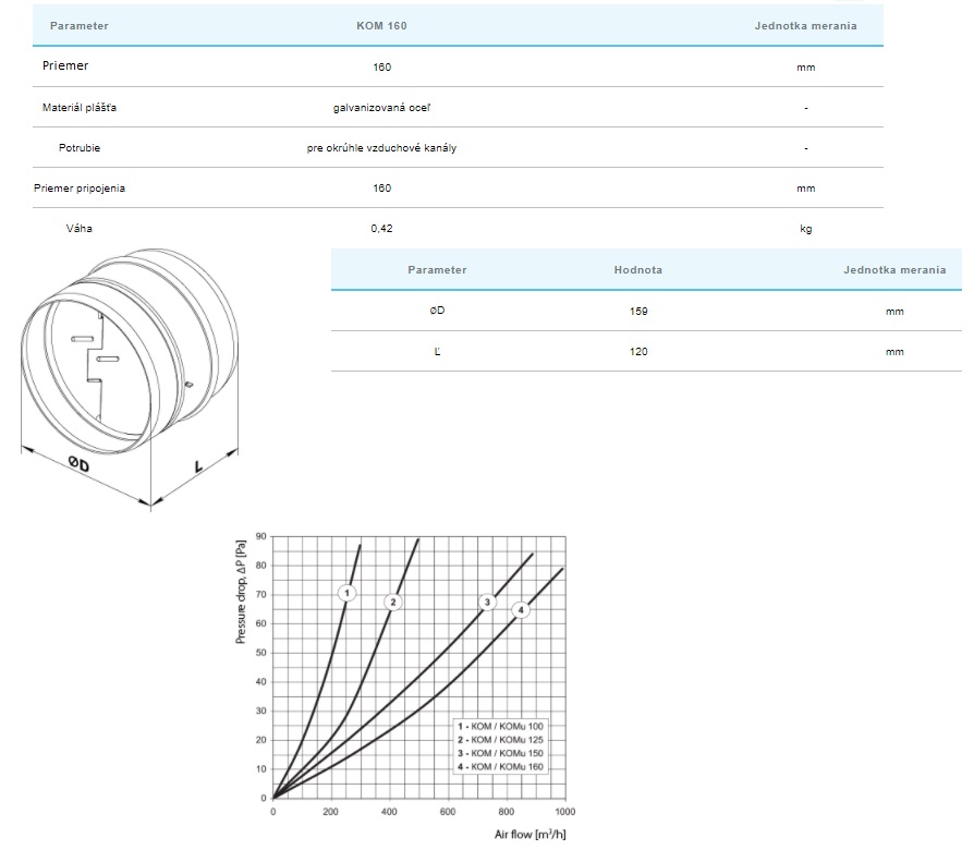 Kovová spätná klapka Ø160mm s pružinou je určená pre okrúhle kanály. Klapka zabraňuje spätnému ťahu, keď je systém vypnutý. Lamely sa otvárajú prúdom vzduchu a zatvárajú sa pomocou pružiny. Klapka je vyrobená z pozinkovaného oceľového krytu s pružinovými hliníkovými lamelami. Je pripojená k okrúhlym vzduchovým kanálom a upevnená svorkami. Os čepele by mala byť vo zvislej polohe. Je potrebné brať do úvahy správny smer prúdenia vzduchu