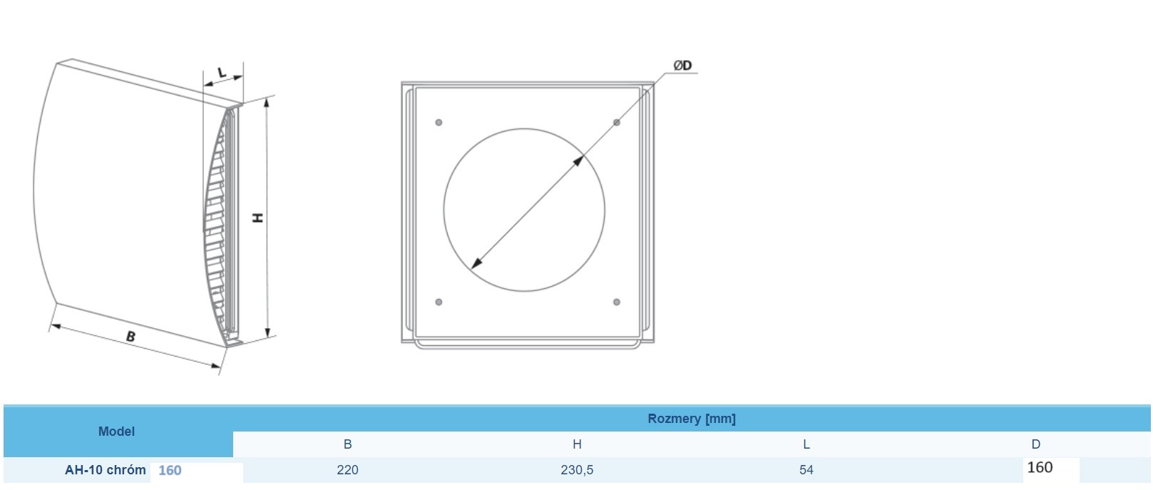 Koncová mriežka pre rekuperátory Blauberg Vento EXPERT AH-10 chróm 160 mm z brúsenej nehrdzavejúcej ocele. AH-10 160 sa pripája na vzduchové potrubie Ø 150 a 160 mm. Vybavený prístreškom na odstránenie kvapiek vody zo stien.