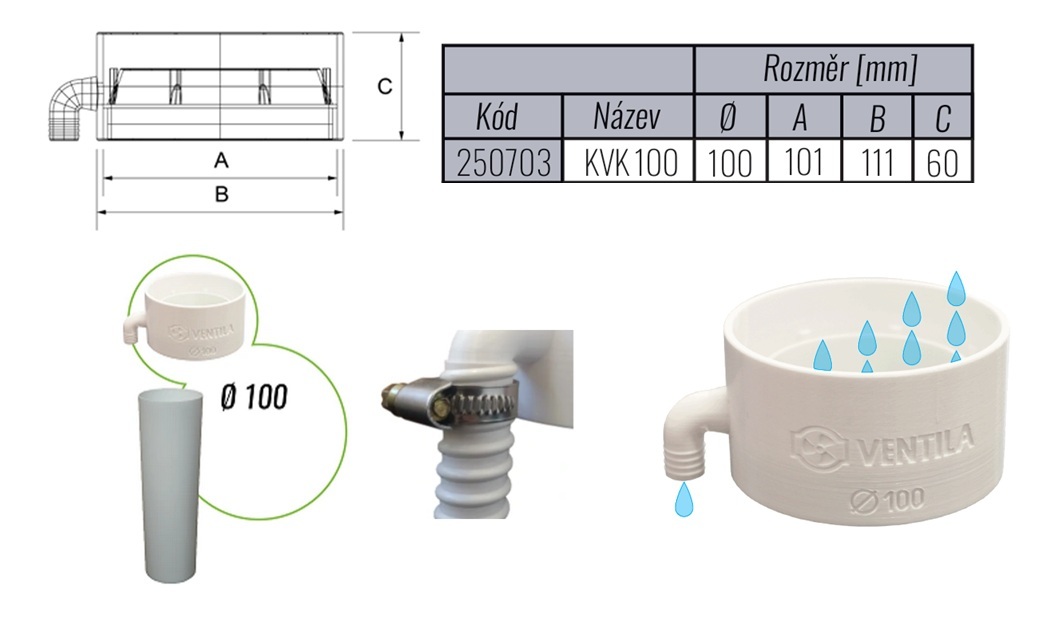Kondenzačná jimka KVK 100mm slúži na odvod nahromadeného kondenzátu (vlhkosť, para) z okrúhlych plastových potrubí, ktorý sa vytvára zrážaním vody vo vnútri potrubia. Kondenzačná jimka KVK je potrebná všade tam, kde dochádza k prechodu teplého a studeného vzduchu (keď je teplý vzduch vyčerpaný smerom von) alebo pri nasávaní pary (kuchynské kapucne, ventilátory pre kúpeľňu). KVK je kompatibilný s kruhovým potrubím, špirou rúrkou a pružnými závesnými hadicami HVAC.
