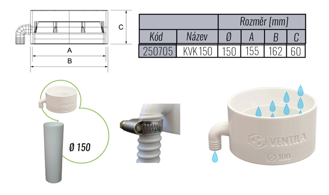 Kondenzačná jimka KVK 150mm slúži na odvod nahromadeného kondenzátu (vlhkosť, para) z potrubia, ktorý vzniká zrážaním vody vo vnútri potrubia. Kondenzačná jimka KVK je nevyhnutná všade tam, kde sa vytvára prechod teplého a studeného vzduchu (keď je teplý vzduch vyčerpaný smerom von) alebo pri nasávaní pary (kuchynské kapucne, ventilátory pre kúpeľňu). KVK je kompatibilná s kruhovým potrubím, špirou rúrkou a pružnými závesnými hadicami HVAC. Odtok kondenzátu môžete použiť pri maximálnej teplote 80 °C. KVK je vyrobená z ABS plastu a je navrhnutá tak, aby zachytila všetok kondenzát vytvorený v potrubí. Z kruhového tela je odtok s priemerom 16 mm. Koniec vývodu je vrúbkovaný pre lepšie zachytenie hadice PE na vypustenie kondenzátu a pre úplné nastavenie odporúčame hadicu pripevniť klipom na hadicu PE k zásuvke.