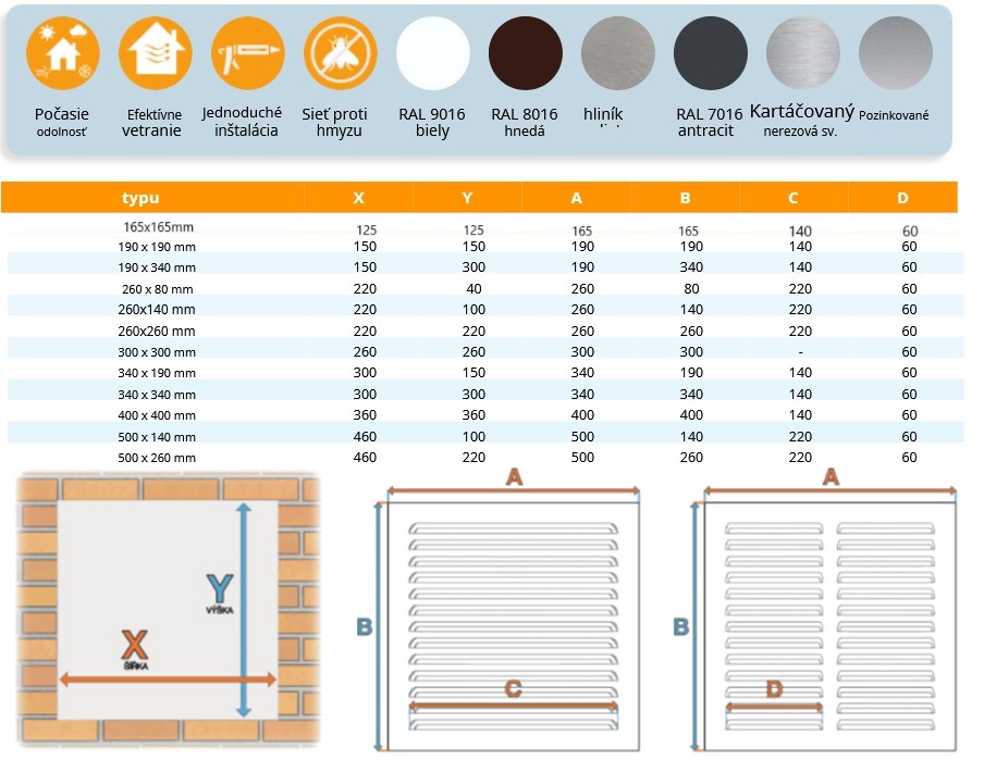 Kovová vetracia mriežka ANTRACIT z pozinkovaného plechu s protidažďovou žalúziou a šírkou prelisu 60 mm. Sila plechu: 0,6 mm, Zn 275 g/m2 + 0,7 mm PVC. Vhodné nalepiť cez otvor o 30 mm menší – najlepšie Mamutom, so sieťkou proti hmyzu.