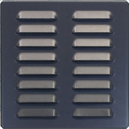 Kovová vetracia mriežka ANTRACIT z pozinkovaného plechu s povrchom Laminated a vysekávanou protidažďovou žalúziou, šírka prelisu 60 mm.