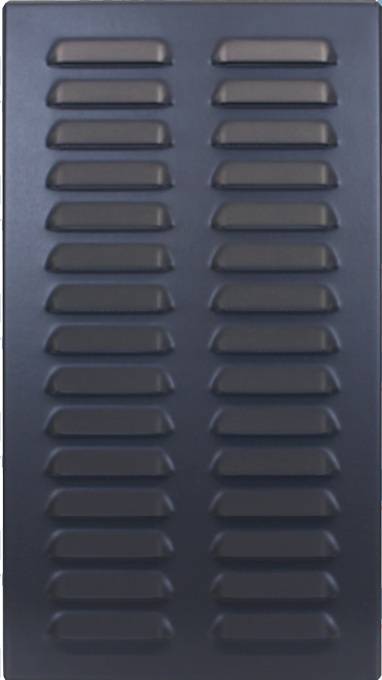 Kovová vetracia mriežka z pozinkovaného plechu ANTRACIT s povrchom Laminated a vysekávanou protidažďovou žalúziou, šírka prelisu 60 mm.
