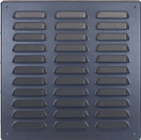 Kovová vetracia mriežka z pozinkovaného plechu ANTRACIT s povrchom Laminated a vysekávanou protidažďovou žalúziou, šírka prelisu 60 mm. Sila plechu: 0,6 mm, Zn 275 g/m2 + 0,7 mm PVC. Vhodné nalepiť cez otvor o 30 mm menší – najlepšie Mamutom, na zadnej strane mriežky sieťka proti hmyzu zo skleneného vlákna.