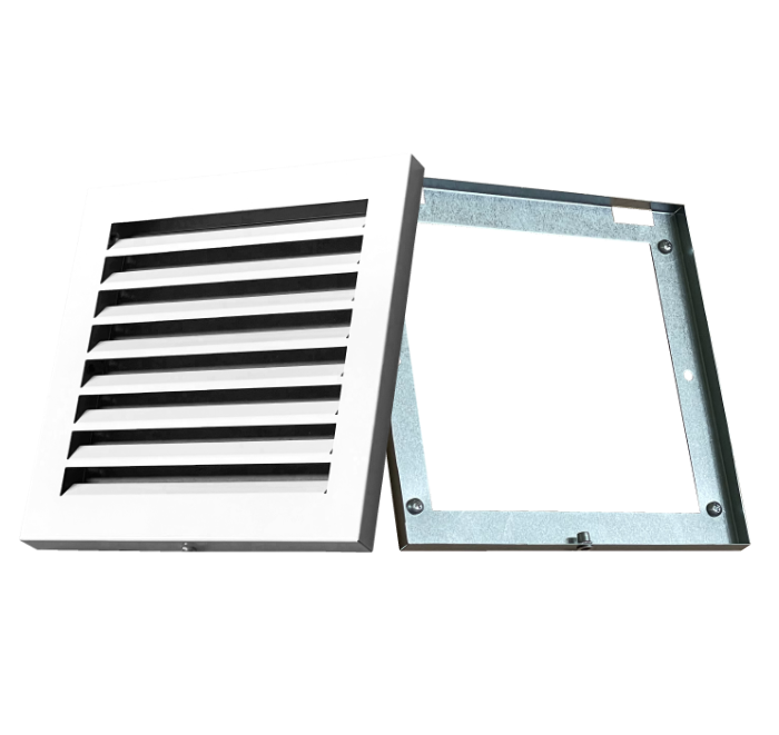 Kovová protidažďová mriežka bez sieťky proti hmyzu je určená na umiestnenie na stenu. Uchytenie je riešené pomocou skrytého závesu na hornej hrane mriežky a zaistenia vďaka jednému vrutu na spodnej strane rámu.