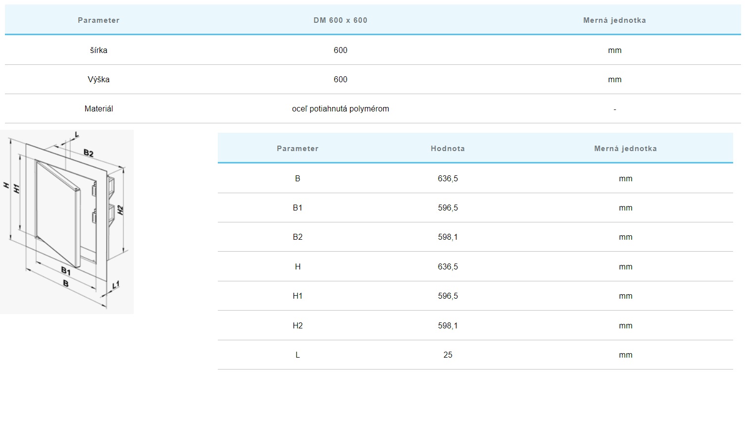 Kovové revízne dvierka 600×600 sú vyrábané zvarovaním z oceľového plechu 0,8 mm. Tieto dvierka obsahujú vonkajší rám, ktorý pomocou lemu zakrýva nerovnosti montážneho otvoru. Na rohoch sú zvarované a otvárateľné vnútorné dvierka spojené samorezkou ako pant. Povrchová úprava revíznych dvierok je biely komaxitový lak, ktorý zabezpečuje antikoróznu ochranu.