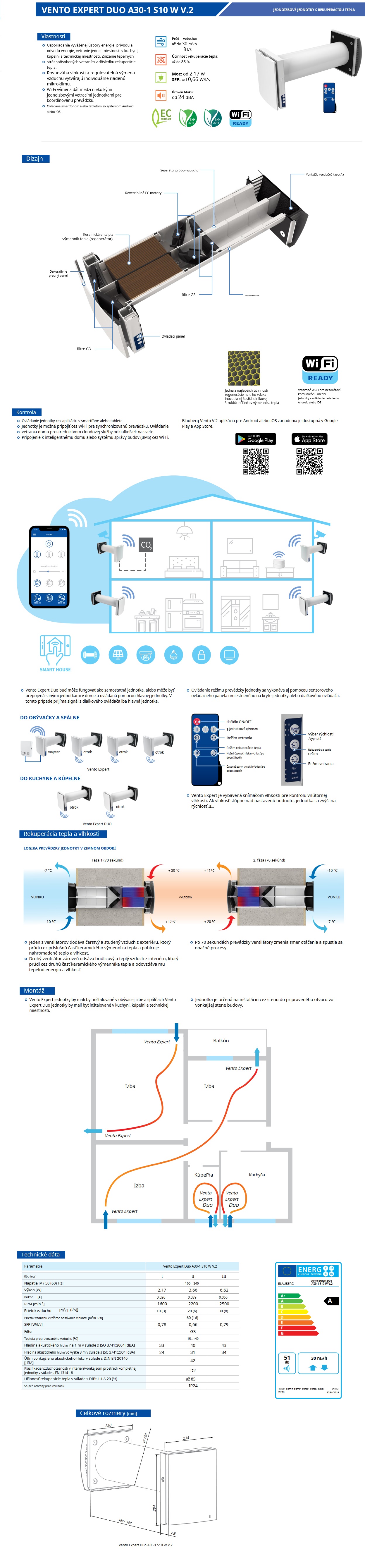 Blauberg VENTO EXPERT DUO A30-1 S10 W V.2-WI-FI je dvojmotorový lokálny rekuperátor s priemerom 160 mm a výkonom 60 m³/h v režime výtlaku. Je určený na hrúbku steny do 50 cm, pričom je možné dokúpiť 70 cm potrubia. Rekuperátor využíva dva reverzibilné EC motory umiestnené v jednom potrubí. Pracuje na princípe 70 sekúnd nasávania čerstvého vzduchu, po ktorých sa motor zastaví a pokračuje odsávaním vzduchu z miestnosti po dobu 70 sekúnd. Tento cyklus sa neustále opakuje. Model Blauberg VENTO Expert Duo A30-1 W-WI-FI má v potrubí rozdelenom prepážkou umiestnené vedľa seba dva motory, pričom jeden motor nasáva a druhý odsáva vzduch z miestnosti.