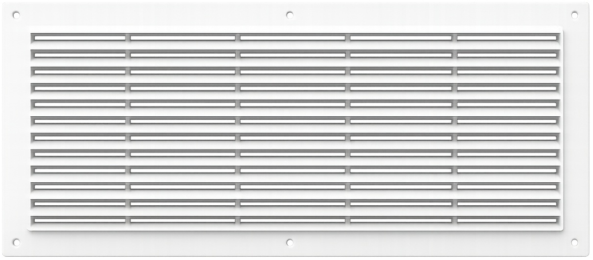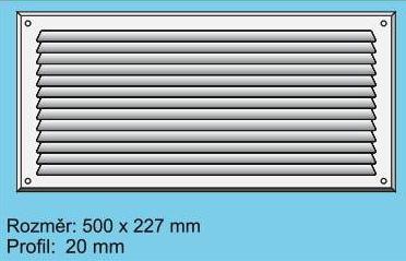 Plastová biela vetracia mriežka A5023 bez sieťky proti hmyzu na prekrytie vzduchotechnických a iných vetracích otvorov. Rozmery: Krycia plocha rozmerovo použiteľná na zakrytie otvoru 500×227 mm. Materiál: ABS plast. Hrúbka: 20 mm.