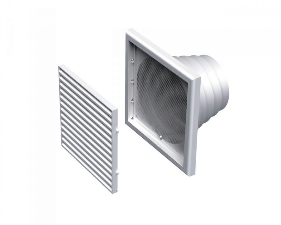 Plastová biela vetracia mriežka MV120VNS so sieťkou proti hmyzu a prírubou.Krycia plocha: 186x186mm / 100-150mm, materiál: ABS plast, odolný proti UV žiareniu. Vetracia mriežka je vyrobená z kvalitného a odolného plastu. Vnútorná časť je pripevnená k základni pomocou západiek pre ľahké čistenie bez demontáže. Upevnenie pomocou skrutiek. Vetracia mriežka má šikmé lamely.