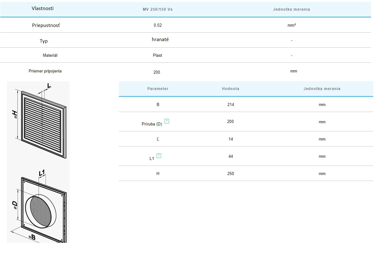 Plastová vetracia mriežka MV250/200VS so sieťkou a prírubou 200mm. Krycia plocha: 250x250mm, materiál: ABS plast, odolný proti UV žiareniu. Vetracia mriežka je vyrobená z kvalitného a odolného plastu. Vnútorná časť je pripevnená k základni pomocou západiek pre ľahké čistenie bez demontáže. Upevnenie pomocou skrutiek alebo lepidla. Vetracia mriežka má šikmé protidažďové lamely.
