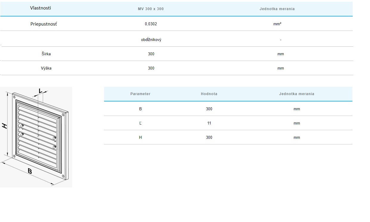 Vetracia mriežka MV300x300S z plastu s UV ochranou a sieťkou proti hmyzu.Krycia plocha: 300×300 mm, materiál: ABS plast, odolný proti UV žiareniu. Vetracia mriežka je vyrobená z kvalitného a odolného plastu. Vnútorná časť je pripevnená k základni pomocou západiek pre ľahké čistenie bez demontáže. Rôzne úpravy upevnenia podľa typu modelu: skrutky, výstupky alebo lepidlo (kremík). Úpravy mriežky so sieťkou proti hmyzu.