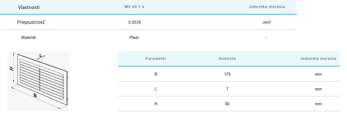 Plastová vetracia mriežka MV80-1S so sieťkou proti hmyzu. Rozmer: 170×80 mm. Materiál: ABS plast, odolný voči UV žiareniu. Vetracia mriežka je vyrobená z kvalitného a odolného plastu. Vnútorná časť je pripevnená k základni pomocou západiek pre ľahké čistenie bez demontáže. Upevnenie pomocou skrutiek. Vetracia mriežka na lepenie.