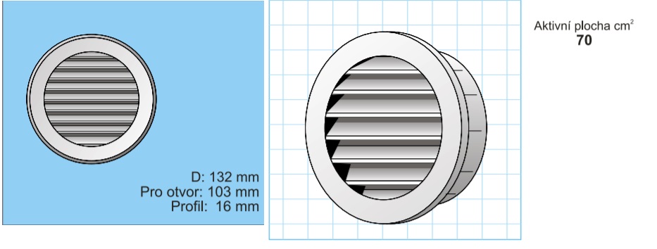 Plastová vetracia mriežka T 11B pre otvor 103mm, krycia plocha 132mm, farba biela, bez sieťky proti hmyzu. Materiál: ABS plast. Vhodná do interiéru aj exteriéru.
