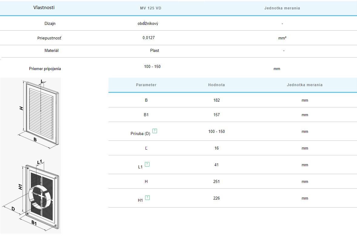 Vetracia mriežka MV150VDS s nastaviteľnou prírubou 100-150mm