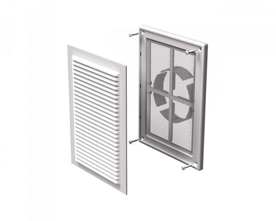Plastová vetracia mriežka biela s krycou plochou 182x251mm a nastaviteľnou prírubou so sieťkou proti hmyzu. Materiál: ABS plast, odolný proti UV žiareniu. Vetracia mriežka je vyrobená z kvalitného a odolného plastu. Vnútorná časť je pripevnená k základni pomocou západiek pre ľahké čistenie bez demontáže. Upevnenie pomocou skrutiek.