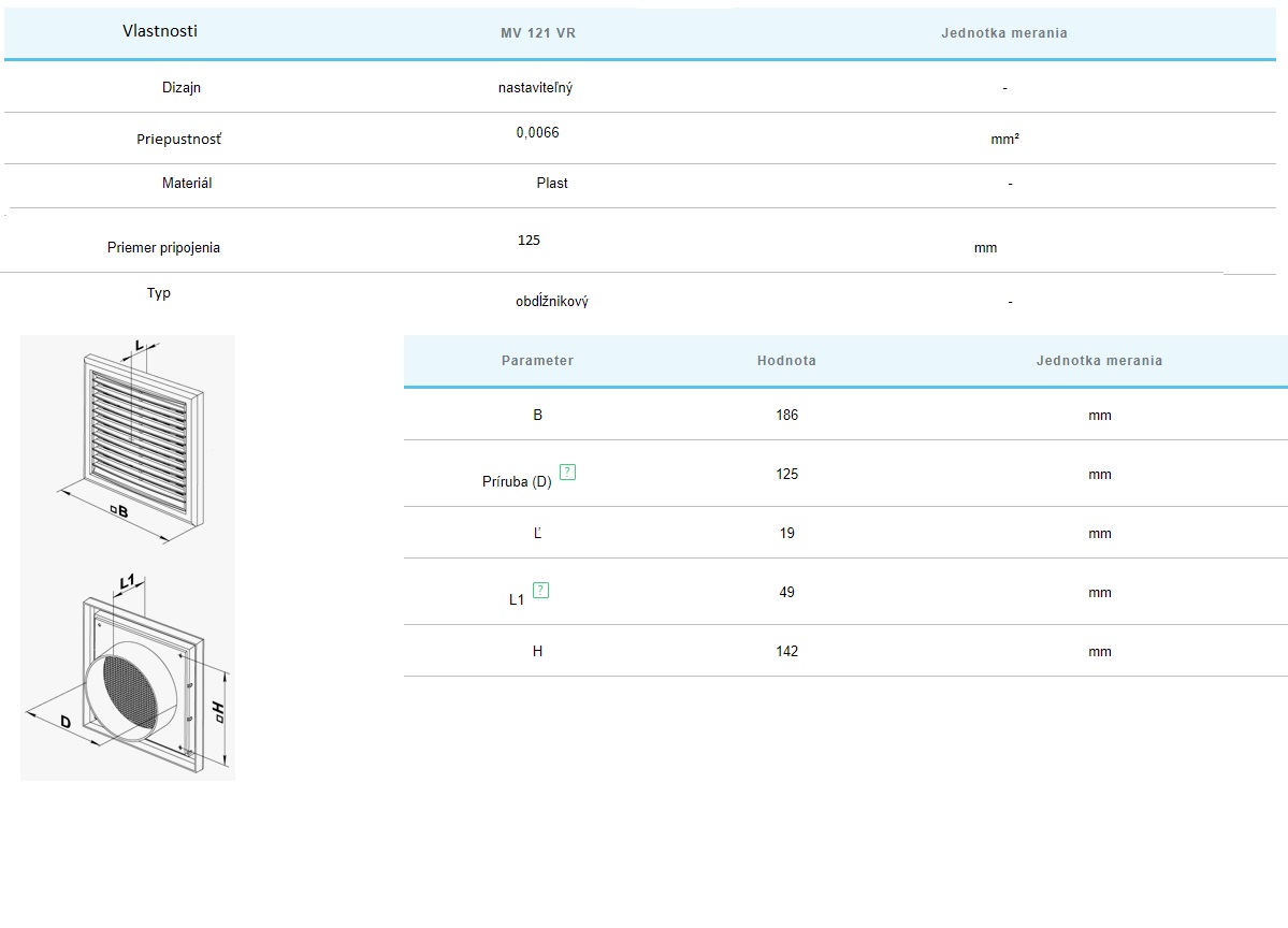 Plastové vetracie mriežky MV121VRS so zatváraním, krycia plocha 186×186/125mm, sú ideálne pre interiérové použitie. Vďaka rovným lamelám zabezpečujú správne rozdelenie prúdu vzduchu v priestoroch. Tieto mriežky sú určené na montáž na stenu alebo strop a sú vyrobené z kvalitného a odolného plastu. Vnútorná časť je pripevnená k rámčeku pomocou západiek, čo umožňuje ľahké čistenie bez demontáže. Upevnenie sa realizuje pomocou skrutiek a zatváranie sa vykonáva lankami.