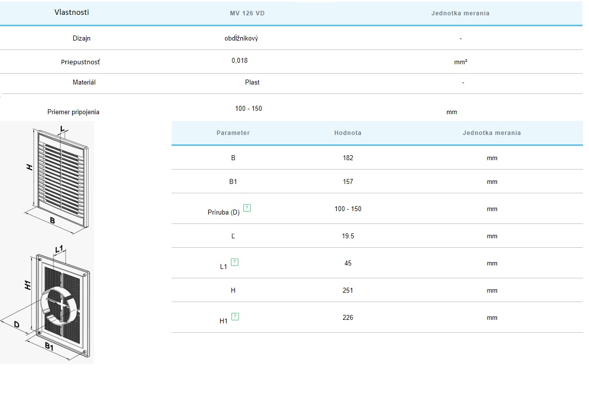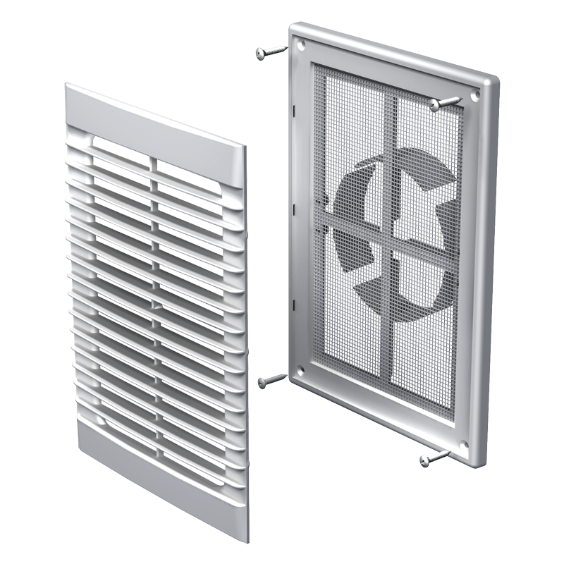 Plastová vetracia mriežka MV126VDS s krycou plochou 182x251mm a rovnými lamelami je určená len do interiéru. Disponuje nastaviteľnou prírubou 100-150mm a sieťkou proti hmyzu. Materiál: ABS plast, odolný proti UV žiareniu. Vetracia mriežka je vyrobená z kvalitného a odolného plastu. Vnútorná časť je pripevnená k základni pomocou západiek, čo umožňuje ľahké čistenie bez demontáže. Upevnenie pomocou skrutiek.