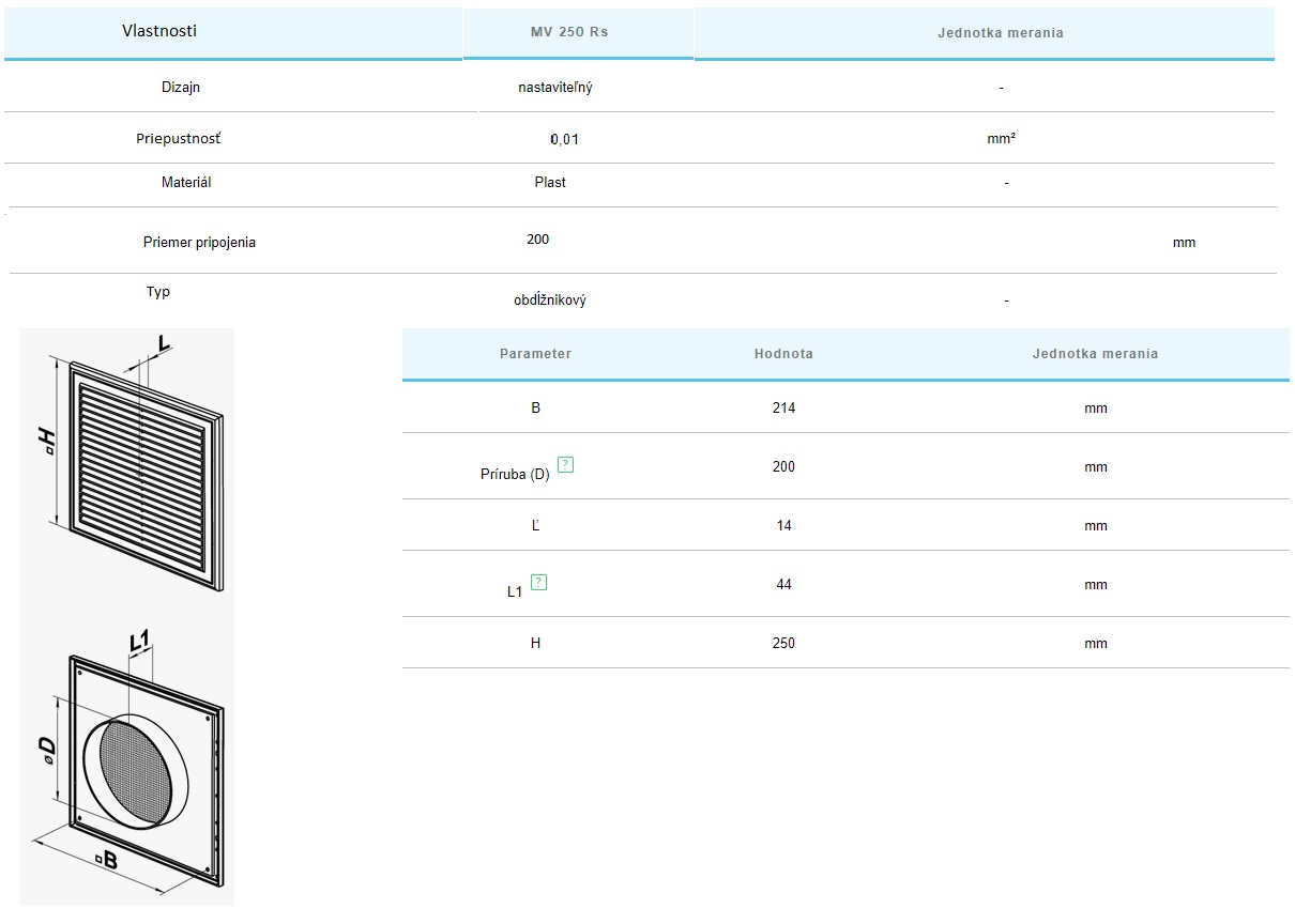 Plastové vetracie mriežky MV250/200VRS so zatváraním a prírubou 200mm sú navrhnuté na správne rozdelenie prúdu vzduchu v priestoroch. Tieto mriežky sú vhodné na montáž na stenu alebo strop. Sú vyrobené z kvalitného a odolného plastu s viacprvkovou štruktúrou. Vnútorná časť je pripevnená k rámčeku pomocou západiek, čo umožňuje jednoduché čistenie bez demontáže. Upevnenie sa realizuje pomocou skrutiek. Vetracia mriežka má šikmé lamely proti dažďu a zatvára sa lankami.