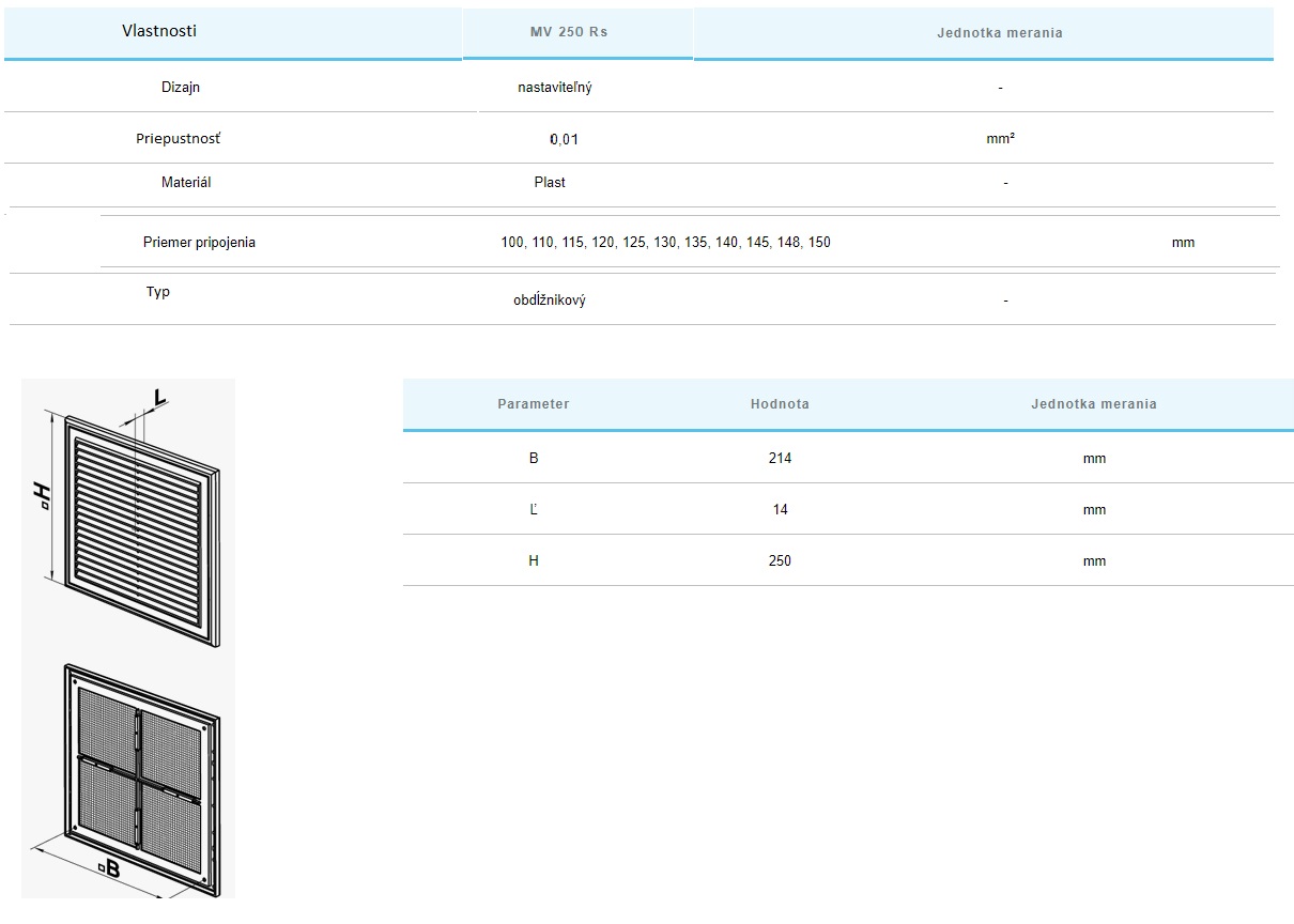 Plastová vetracia mriežka MV250 RS so zatváraním má kryciu plochu 250x250mm a slúži na správne rozdelenie prúdu vzduchu v priestoroch. Tieto mriežky sú určené na montáž na stenu alebo na strop. Sú vyrobené z kvalitného a odolného plastu a majú viac prvkovú štruktúru. Vnútorná časť je pripevnená k rámčeku pomocou západiek, čo umožňuje ľahké čistenie bez demontáže. Upevnenie sa vykonáva pomocou skrutiek. Vetracia mriežka je vybavená šikmými lamelami proti dažďu a zatvára sa lankami.
