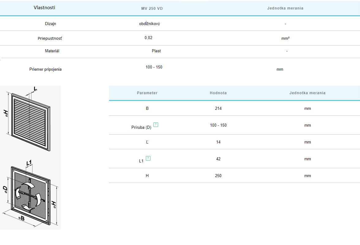 MV250VDS Vetracia mriežka s nastaviteľnou prírubou 100-150mm