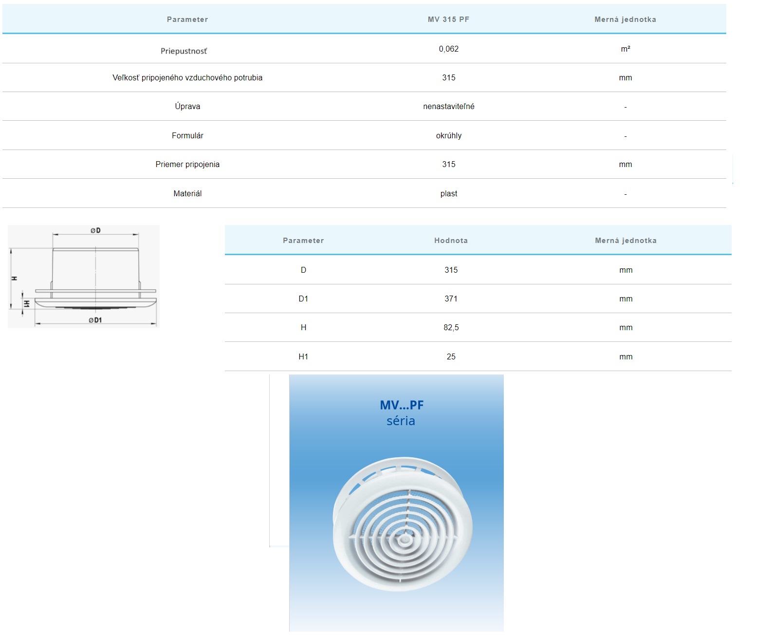 Stropný difúzer MV315PFS z plastu je určený na prívod vetrania, klimatizácie a kúrenia. Vhodný na montáž na stenu alebo do falošného stropu. Zaisťuje správnu cirkuláciu vzduchu. Vyrobený z kvalitného plastu s aerodynamickým ventilom pre rovnomernú distribúciu vzduchu. Jednoduchá montáž a tesniaci krúžok pre pevné uchytenie. Obsahuje sieťku proti hmyzu.