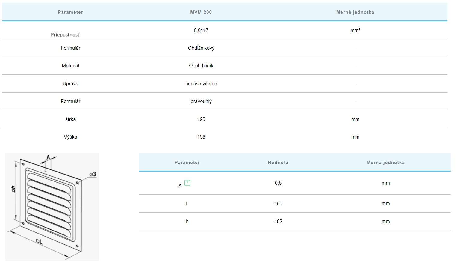 Kovové vetracie mriežky MVM 200ZN sú vyrobené z pozinkovanej ocele a sú vhodné na farebné polymérové lakovanie. Disponujú skrutkovým upevnením. Kvalitné materiály a zinko-fosfátová úprava zaisťujú celistvosť náteru a poskytujú spoľahlivú ochranu proti korózii. K dispozícii sú úpravy s ochrannou sieťkou proti hmyzu.