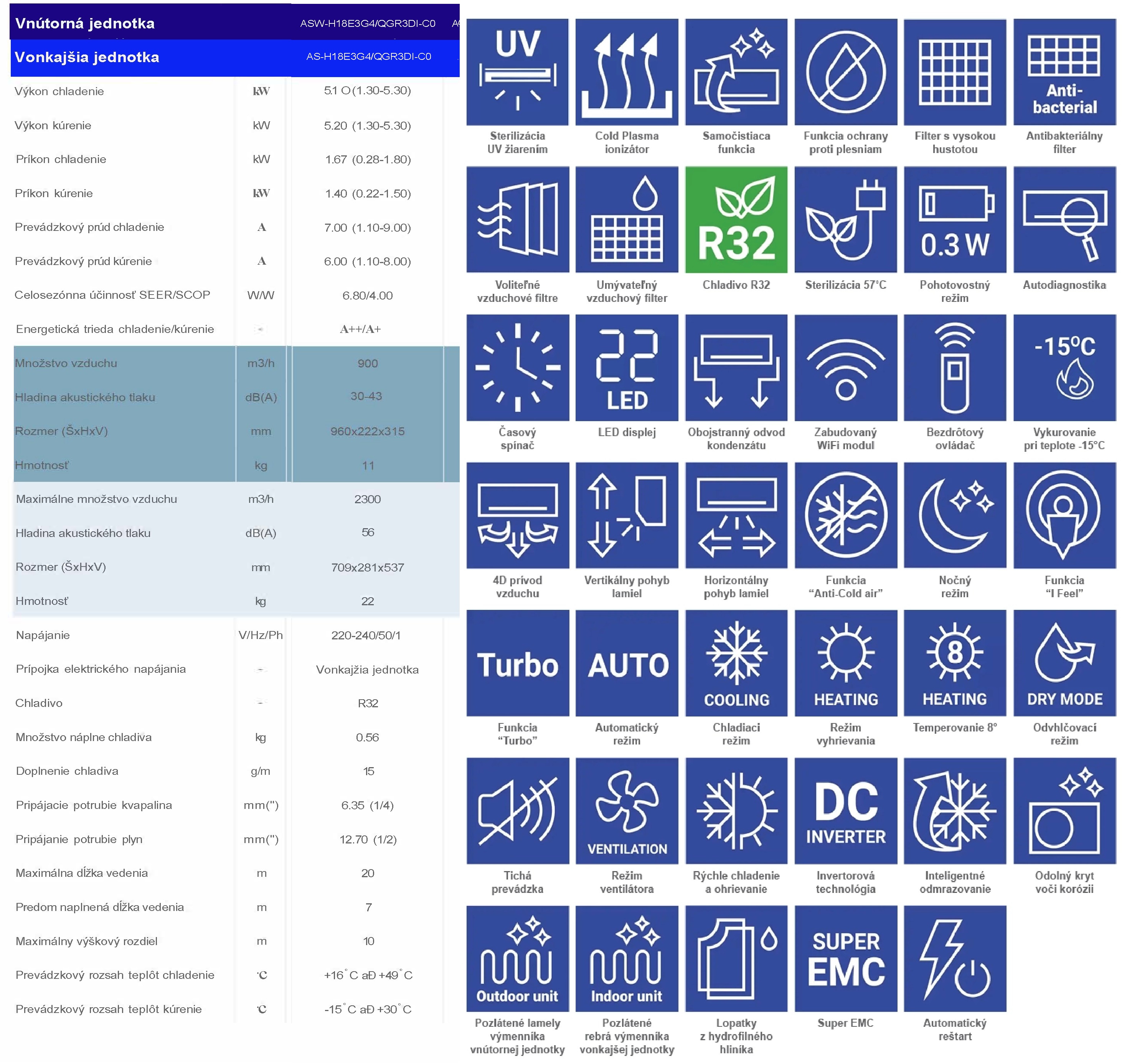 Invertorová technológia a energetická trieda A++ zabezpečujú vysokú energetickú účinnosť a spoľahlivosť. Je ideálny pre miestnosti s chladiacim výkonom 5,1 kW a vykurovacím výkonom 5,2 kW, vhodný pre priestory s rozlohou 35–55 m².