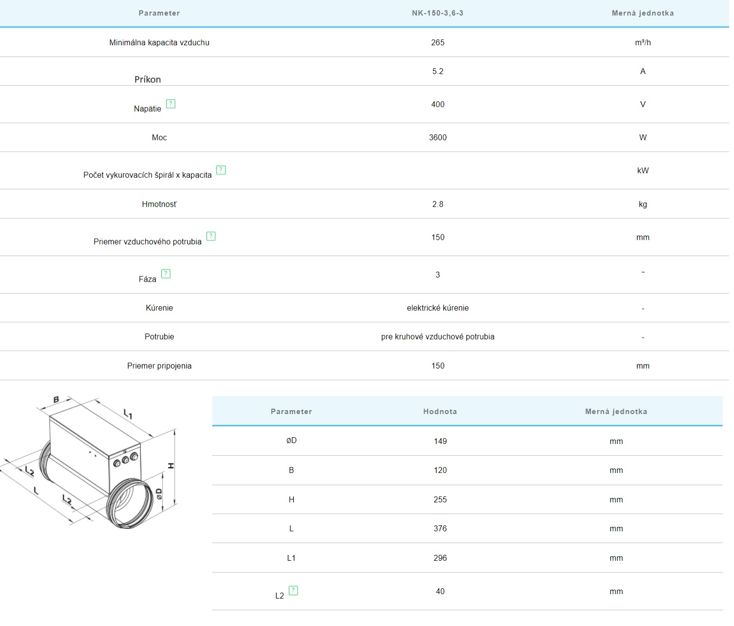 VENTS NK -150-3,6-3 Elektrický ohrievač 150mm 3,6kW 3fázový